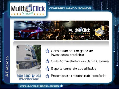 MultiClick Brasil é uma empresa genuinamente brasileira constituída por um grupo de investidores brasileiros, ao qual adota o sistema de Marketing Multinível como forma de disseminar suas ações/produtos perante o mercado. Sua sede fica em Balneário Camboriú/SC e a empresa está totalmente legalizada junto à Receita federal do Brasil. (Para consultar seu CNPJ, acesse o site da Receita Federal do Brasile digite os seu CNPJ: 102.487.590/001-41).